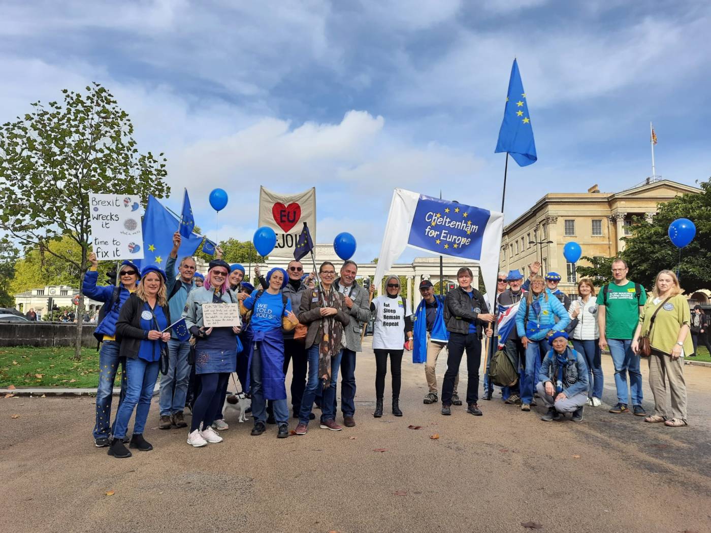 On Saturday, 22 October 2022, 25 of us and two dogs travelled on the coach organised by Cheltenham for Europe from Cheltenham to London to join the National Rejoin March (NRM). A couple from Stroud, along with their excited dog, boarded the coach in Burford. Our team included some people who had participated in previous pro-EU marches in London
