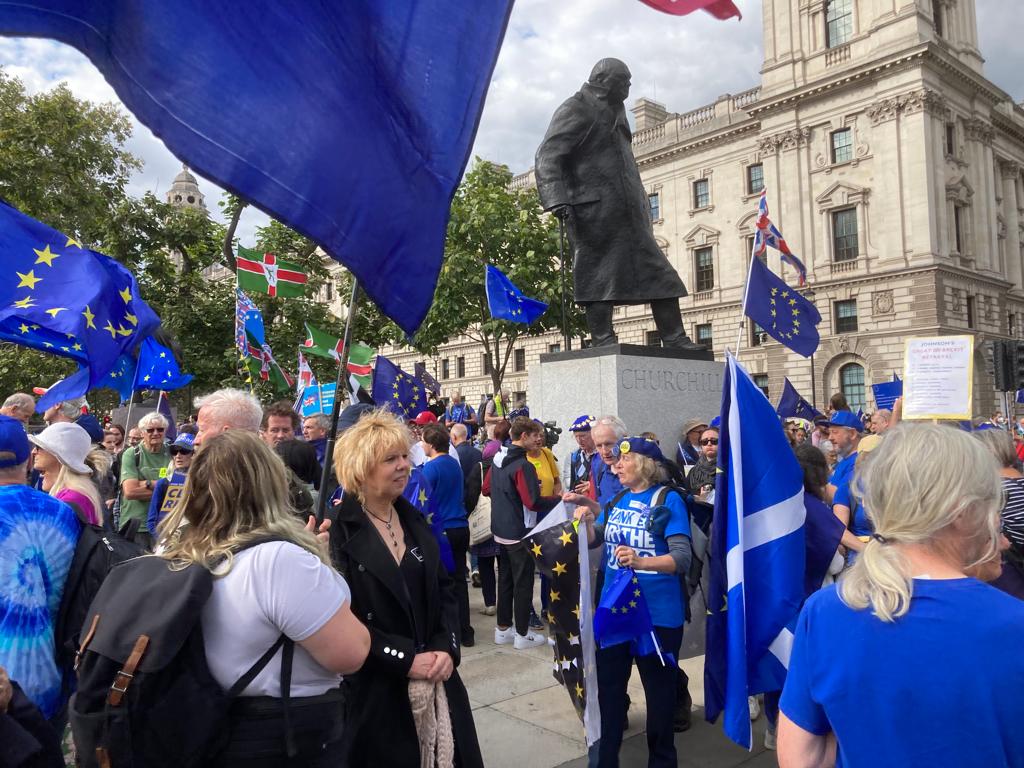On 23 September, Cheltenham for Europe put on a full coach for the journey from Royal Well to London to take part in the National Rejoin March. Once again it was encouraging to meet, and march with, thousands of fellow European supporters. One surprising factor was the level of support from passers-by: pedestrians out shopping or sightseeing, passengers in buses who waved their support, and motorists who hooted their horns and waved. As the long winding throng of many thousands of European supporters made their way along Whitehall, towards Westminster, there was a loud and sustained chorus of booing as we passed the entrance to Downing Street– a reminder to the occupants of that Street that we haven’t ‘Got over it’, it hasn’t ‘Gone away’ and never will. There were some inspirational speeches from various well known and devoted pro-European individuals, including Guy Verhofstadt, Steve Bray, Gina Miller, Femi Oluwole, Mike Galsworthy, Professor A. C. Grayling and Madeleina Kay. It was a long and tiring day, but so very heartening to meet so many fellow ‘Europeans’ from all over the country.
