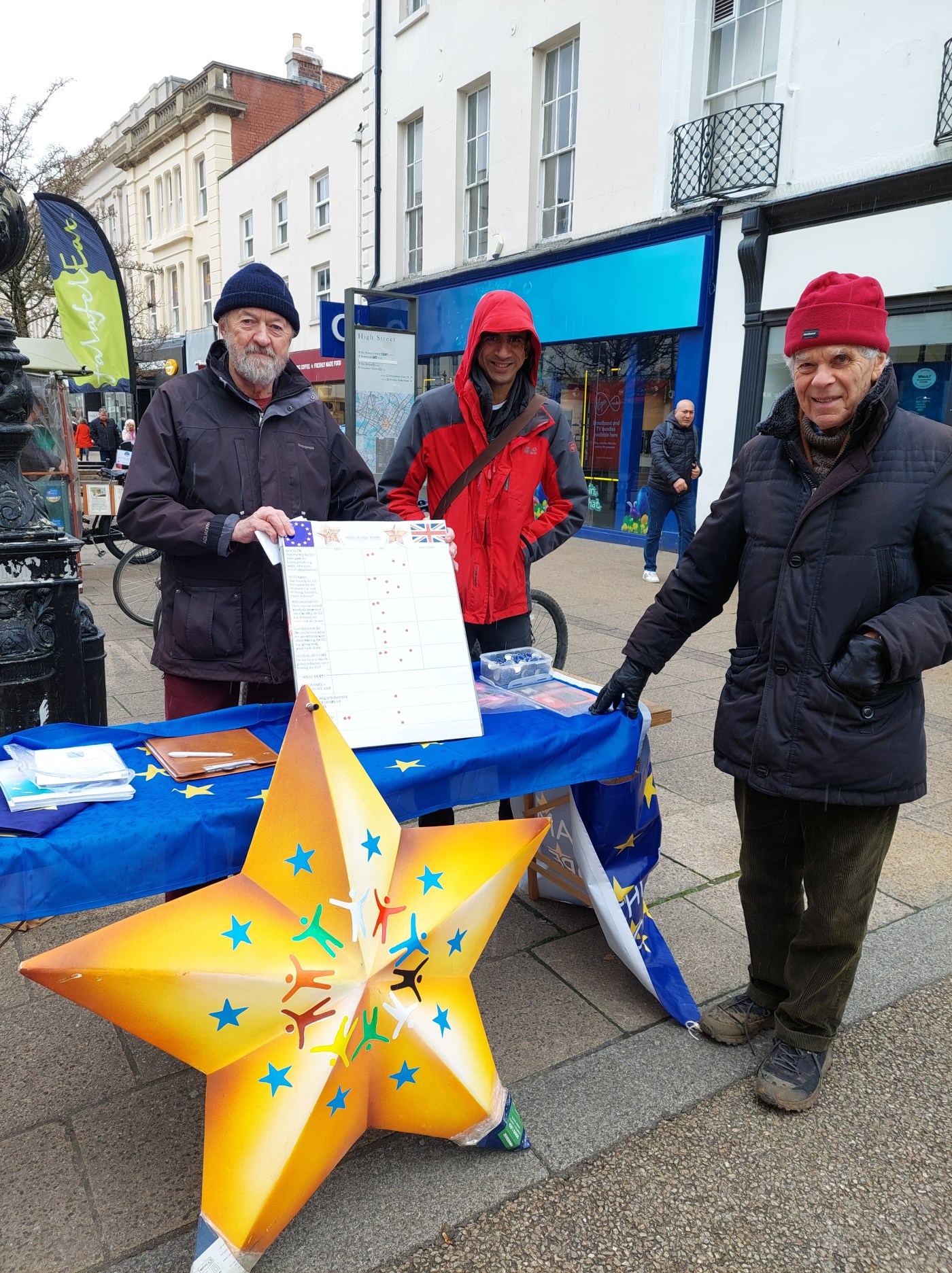 We got out to Cheltenham High Street for our street stall on 23 March accompanied by the Junior Star of European Unity and Peace. The Junior Star, along with the considerably larger Senior Star, is designed to promote discussion and debate on the future of the UK and our place in Europe.