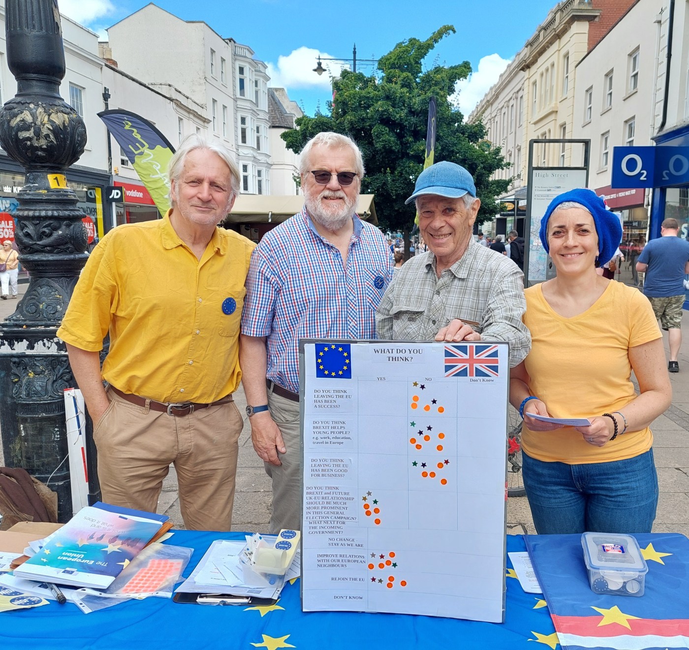 We handed out leaflets which advised a tactical vote for the Liberal Democrats in Cheltenham on 4 July as well as advising about how the UK-EU relationship can improve.