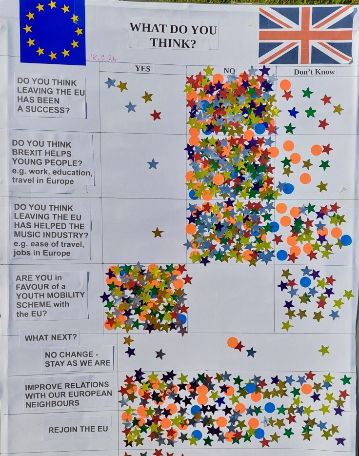 Interestingly there were lots of don’t knows about the effect of the UK leaving the UK on the music industry. We handed out leaflets regarding the Face the Music run by the European Movement which summarise the difficulty musicians are experiencing (see below).